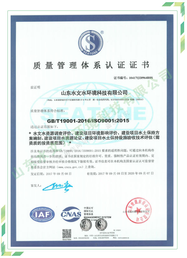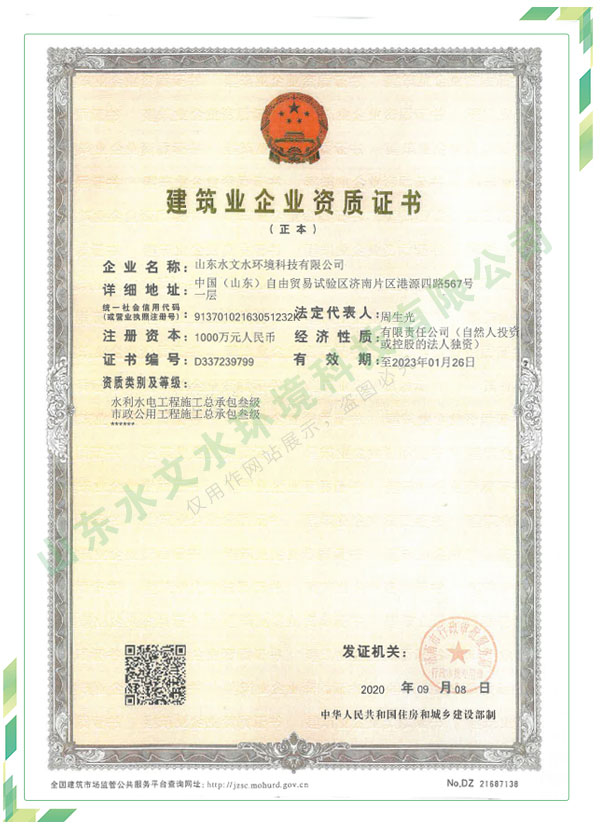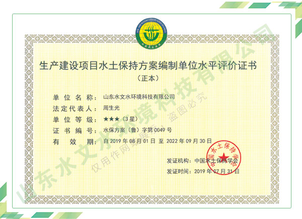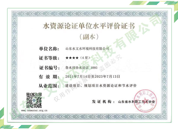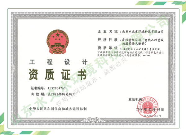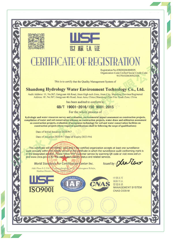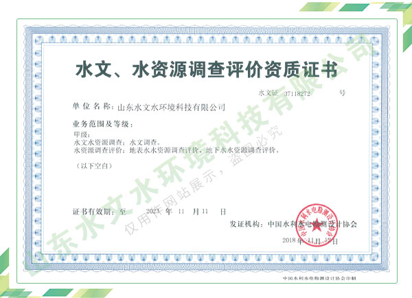 公司擁有水利工程設計、水土保持、水文水資源調查評價、水資源論證、建設項目環(huán)境影響評價、市政公用工程施工總承包、水利水電工程施工總承包、電子與智能化工程專業(yè)承包等資質,2017年通過質量管理體系、環(huán)境管理體系、職業(yè)健康安全管理體系認證;2020年被評為國家級高新技術企業(yè),同年被中國水利企業(yè)協會推薦為第一批“合同節(jié)水服務企業(yè)”;2021年被山東省、濟南市評為 “專精特新”中小企業(yè)。業(yè)務范圍涉及水利工程設計;節(jié)水設計、改造、水平衡測試;山洪災害調查;城市水資源調查評價;建設項目水土保持方案編制、監(jiān)測、驗收、水土保持規(guī)劃;水安全保障規(guī)劃、建設項目水資源論證、規(guī)劃水資源論證;建設項目環(huán)境影響評價;入河排污口論證;防洪影響評價;市政公用工程施工、水利水電工程施工、電子與智能化工程施工等。